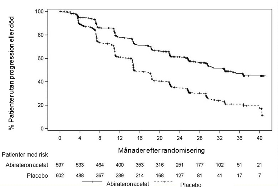 Vid den planerade rPFS analysen fanns det 401 händelser, 150 (28 %) av patienterna som behandlades med abirateronacetat och 251 (46 %) av patienterna som behandlades med placebo hade radiografiska tecken på progression eller hade avlidit. En signifikant skillnad i rPFS mellan behandlingsgrupperna observerades (se tabell 4 och figur 3).