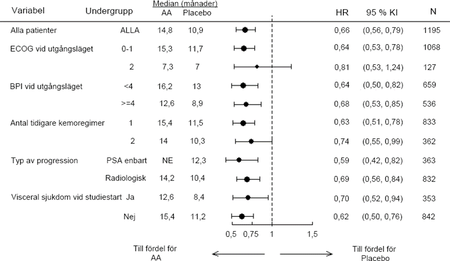 AA=abirateronacetat, BPI=Brief Pain Inventory, C.I.=konfidensintervall, ECOG=Eastern Cooperative Oncology Group Performance Score, HR=riskkvot, NE=kan ej bedömas