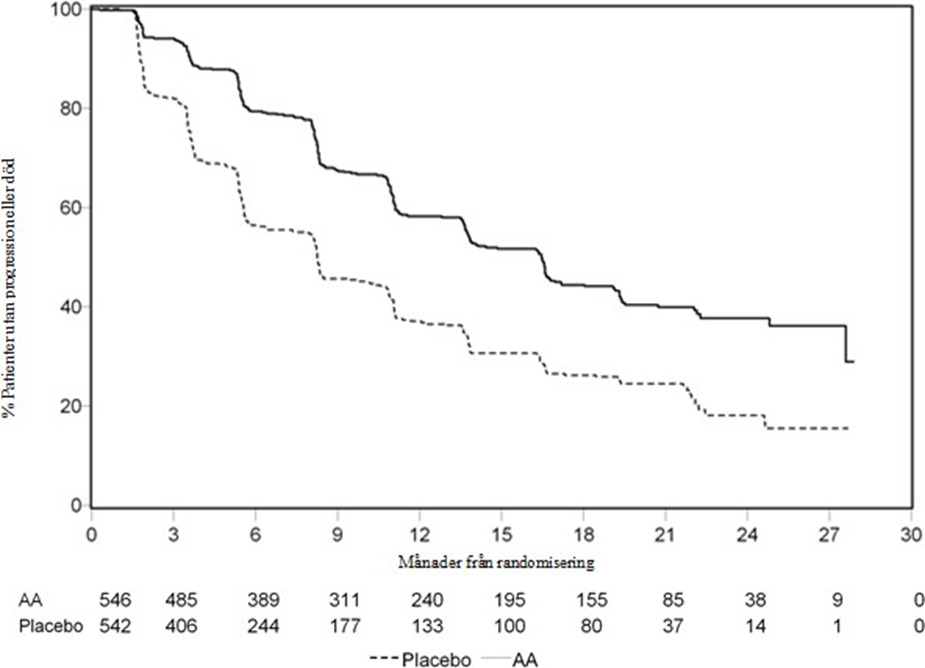 En statistiskt signifikant förbättring av OS till fördel för AA-P plus ADT observerades med en 34 % minskning av risken för dödsfall jämfört med placebo plus ADT (riskkvot = 0,66; 95 % CI: 0,56, 0,78; p < 0,0001), (se tabell 3 och figur 2).