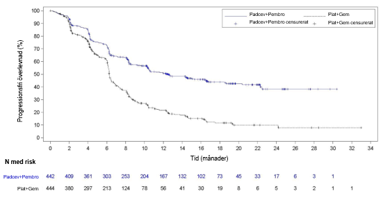 Patienter som randomiserades till armen som fick gemcitabin och platinabaserad kemoterapi tilläts få underhållsbehandling med immunterapiläkemedel (t.ex. avelumab). Randomiseringen stratifierades efter lämplighet för cisplatinbehandling (lämplig jämfört med olämplig), PD‑L1-uttryck (CPS ≥ 10 jämfört med CPS < 10) och förekomst av levermetastaser (förekomst jämfört med frånvaro). PD‑L1-uttrycket baserades på pharmDx-kitet PD-L1 IHC 22C3.
