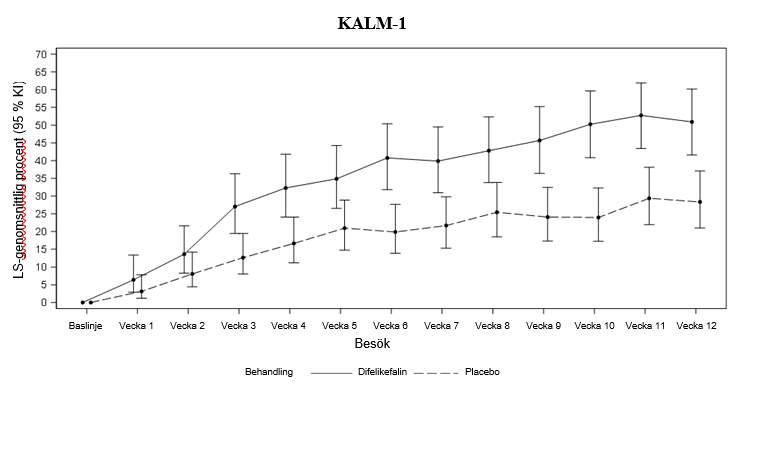 I två pivotala kliniska fas‑3 studier med liknande dubbelblind, randomiserad, placebokontrollerad utformning (KALM‑1 och KALM‑2), fick patienter med kronisk njursjukdom på hemodialys som hade måttlig till svår klåda, antingen placebo eller 0,5 mikrogram/kg difelikefalin intravenöst 3 gånger per vecka, under 12 veckor. Maximalt 4 doser per vecka var tillåtet till patienter som fick ytterligare dialys under en given vecka. Det primära effektmåttet i båda studierna var procentandelen patienter som uppnådde minst en 3‑poängs minskning från baslinjen på den numeriska värderingsskalan för värsta klåda (Worst Itching-Numerical Rating Scale, WI-NRS) vid 12 veckor. De huvudsakliga sekundära effektmåtten i båda studierna var procentandelarna patienter med en förbättring av WI-RNS på minst 4 poäng efter 12 veckor och förändringarna i klådans svårighetsgrad och livskvaliteten i relation till klådan (quality of life, QoL) mätt med totalt Skindex‑10 och 5‑D‑skalan för klåda. En svarsanalys baserat på frågeformuläret ”Patient Global Impression of Change" var också inkluderad.
