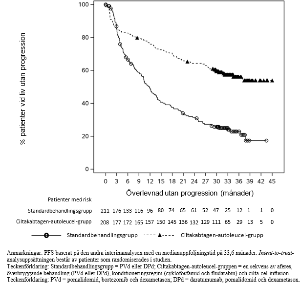 Av de 419 patienter som randomiserades (208 till CARVYKTI och 211 till standardbehandling) var 57 % män, 75 % kaukasier, 3 % svarta eller afroamerikaner och 7 % hispanics eller latinos. Medianåldern för patienterna var 61 år (intervall: 28 till 80 år). Patienterna hade i median fått 2 (intervall: 1 till 3) tidigare behandlingslinjer och 85 % av patienterna hade tidigare fått autolog stamcellstransplantation (ASCT). Nittionio procent av patienterna var refraktära mot sin sista tidigare behandlingslinje. Fyrtioåtta procent var refraktära mot en proteasomhämmare (PI) och 100 % var refraktära mot ett immunmodulerande medel.