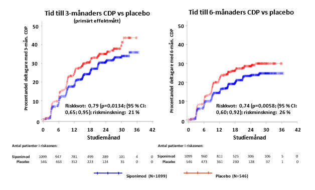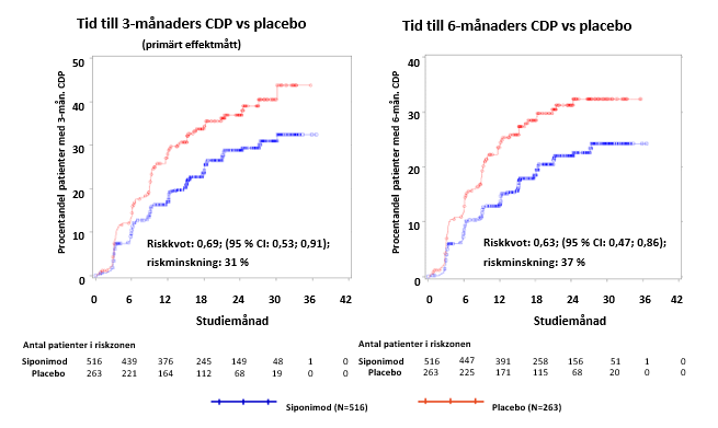 Tid till debut för 3 månaders och 6 månaders bekräftad progression av funktionsnedsättning, CDP var signifikant längre med siponimod. Risken för 3-månaders CDP var 21 % lägre med Mayzent än med placebo (riskkvot [HR] 0,79; p=0,0134) och risken för 6-månaders CDP med Mayzent var 26 % lägre än med placebo (HR 0,74; p=0,0058).