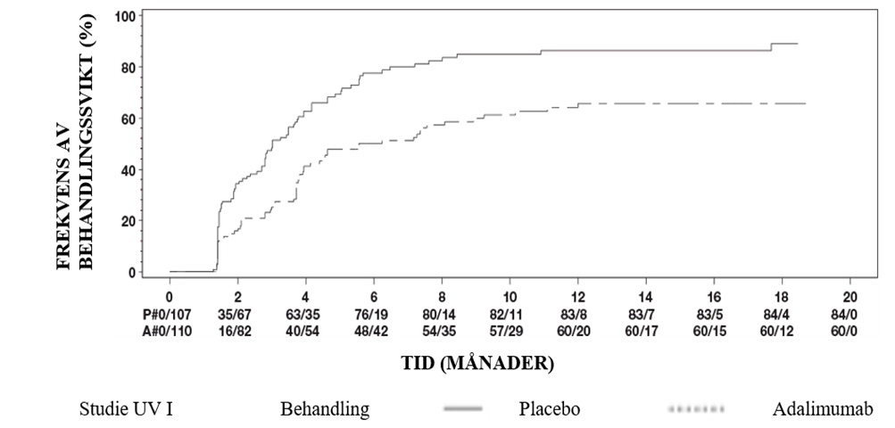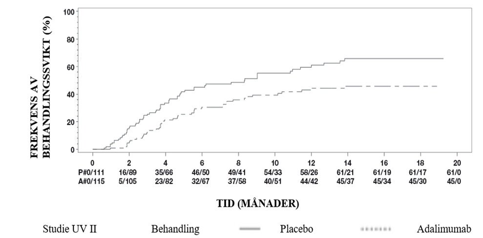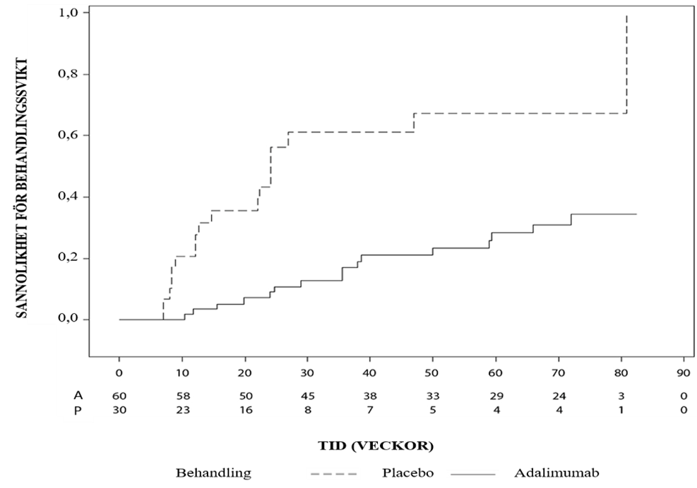 Adalimumab fördröjde signifikant tiden till behandlingssvikt, jämfört med placebo (se figur 2, P < 0,0001 från log-ranktest). Mediantiden till behandlingssvikt var 24,1 veckor för patienter som behandlades med placebo, medan mediantiden till behandlingssvikt inte var uppskattningsbar för patienter som behandlades med adalimumab eftersom mindre än hälften av dessa patienter upplevde behandlingssvikt. Adalimumab minskade signifikant risken för behandlingssvikt med 75 % i jämförelse med placebo, vilket visas av riskkvoten (hazard ratio, HR) (HR = 0,25 [95 % KI: 0,12, 0,49]).