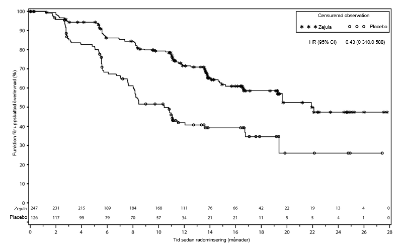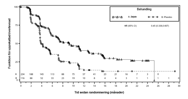 Primärt effektmått var progressionsfri överlevnad (PFS), bestämd genom blindad, oberoende granskning (BICR) enligt RECIST, version 1.1. PFS-tester utfördes hierarkiskt: först i HRD-populationen, sedan i den totala populationen. Sekundära effektmått inkluderade PFS efter den första efterföljande behandlingen (PFS2) och total överlevnad (OS) (tabell 5). Medianåldern var 62 år bland patienter randomiserade till niraparib (intervall 32‑85 år) eller placebo (intervall 33‑88 år). 89 % av alla patienter var vita. 69 % av patienterna randomiserade till niraparib och 71 % av patienterna randomiserade till placebo hade en ECOG på 0 vid studiestart. I den totala populationen hade 65 % av patienterna sjukdom i stadium III och 35 % hade sjukdom i stadium IV. I den totala populationen var det primära tumörstället hos de flesta patienterna (≥80 %) äggstockarna, och de flesta patienterna (>90 %) hade tumörer med serös histologi. 67 % av patienterna fick NACT. 69 % av patienterna hade komplett respons på första linjens behandling med platinumbaserad cytostatika. Totalt 6 patienter i Zejula-gruppen hade fått bevacizumab som tidigare behandling för ovarialcancer.