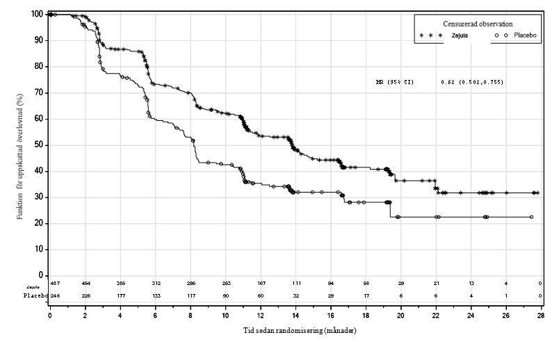 Median-OS i populationen med fungerande HR (n = 249) var 36,6 månader för patienter randomiserade till Zejula jämfört med 32,2 månader för placebo, med en riskkvot på 0,93 (95 % CI: 0,69; 1,26).