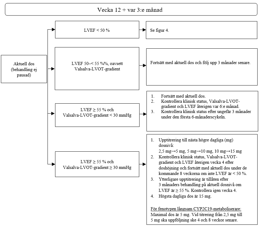 När en individuell underhållsdos har uppnåtts och LVEF är ≥ 55 % ska patienterna bedömas 6:e månad. Patienter med LVEF 50 – < 55 %, oavsett Valsalva-LVOT-gradient, ska bedömas var 3:e månad (se figur 3). Om LVEF vid något besök är < 50 % ska behandlingen avbrytas i minst 4 veckor och återupptas först när LVEF återgått till ≥ 50 % (se figur 4).