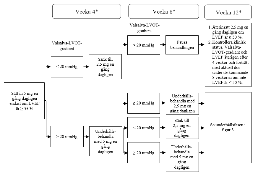 Den rekommenderade startdosen är 2,5 mg peroralt en gång dagligen. Den maximala dosen är 5 mg en gång dagligen. Patienten ska utvärderas avseende tidigt kliniskt svar genom vänsterkammarens utflödesgradient (left ventricular outflow tract [LVOT]) vid Valsalvamanövern 4 och 8 veckor efter behandlingsstart (se figur 1).