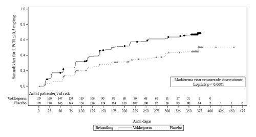 Den tid som krävs för att uppnå en 50-procentig minskning av UPCR var signifikant kortare för voklosporingruppen än för placebogruppen (riskkvot 2,05; 95 % KI: 1,62; 2,60; p < 0,001). Mediantiden för den 50-procentiga minskningen av UPCR var 29 dagar för voklosporin jämfört med 63 dagar för placebo (figur 2).
