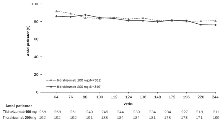Av de patienter som slutförde den dubbelblinda perioden gick 506 patienter (79 %) i reSURFACE 1 och 730 patienter (97 %) i reSURFACE 2 över till förlängningsperioden. I de olika studierna var det minst 76 % av patienterna med ett PASI 90-svar vid slutet av den dubbelblinda perioden som upprätthöll ett PASI 90-svar under förlängningsperioden när behandling med tildrakizumab 100 mg eller 200 mg fortsatte under en period på 192 veckor (figur 2 och figur 3).