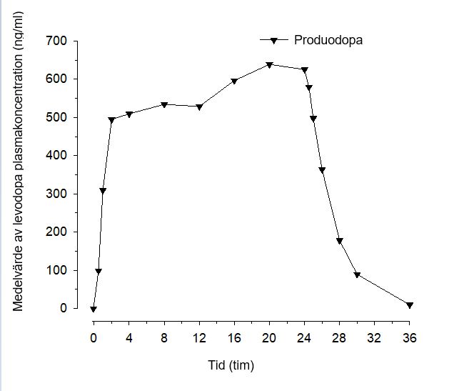 Efter administrering av Produodopa till friska försökspersoner uppnås steady state för levodopa snabbt, vanligtvis inom 2 timmar, och bibehålls under infusionsperioden. Figur 1 nedan visar exponeringen för levodopa efter 24 timmars administrering av Produodopa.
