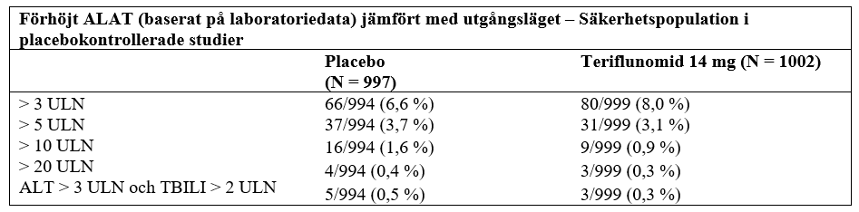 Fall av läkemedelsinducerade leverskador, vilka ibland varit livshotande, har observerats vid behandling med teriflunomid. De flesta fall av läkemedelsinducerade leverskador inträffade flera veckor eller flera månader efter behandlingsstart med teriflunomid, men läkemedelsinducerade leverskador kan även uppträda vid långvarig användning.
