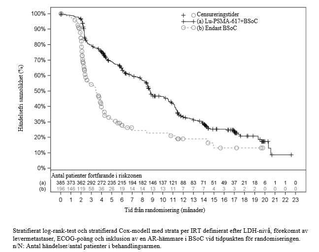Effekten av Pluvicto hos patienter med progressiv, PSMA-positiv mCRPC utvärderades i VISION, en randomiserad, öppen multicenterstudie i fas III. Åttahundratrettioen (N=831) vuxna patienter randomiserades (2:1) till att få antingen Pluvicto 7 400 MBq var 6:e vecka i upp till totalt 6 doser plus bästa standardbehandling (BSoC) (N=551) eller enbart BSoC (N=280). Patienter som fick 4 doser Pluvicto bedömdes på nytt avseende tecken på respons, tecken på kvarstående sjukdom och tolerabilitet och kunde få upp till ytterligare 2 doser enligt läkarens bedömning.