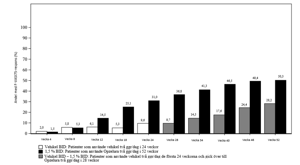 Vecka 52 var den observerade responsfrekvensen för F‑VASI90, T‑VASI50 och VNS 30,3 %, 51,1 % respektive 36,3 % i den sammanslagna ITT‑populationen.