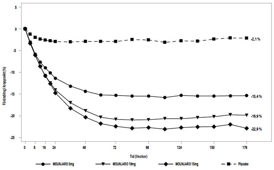 Mounjaro är avsett som ett komplement till en lågkaloridiet och ökad fysisk aktivitet för viktkontroll, inklusive viktminskning och vikthantering, hos vuxna med ett initialt BMI (kroppsmasseindex) på