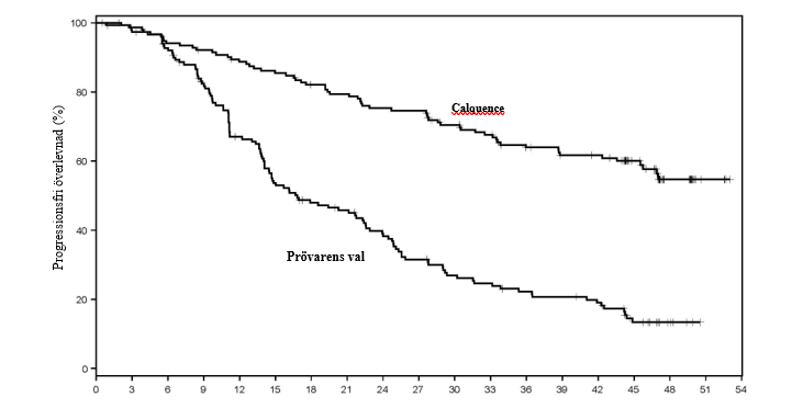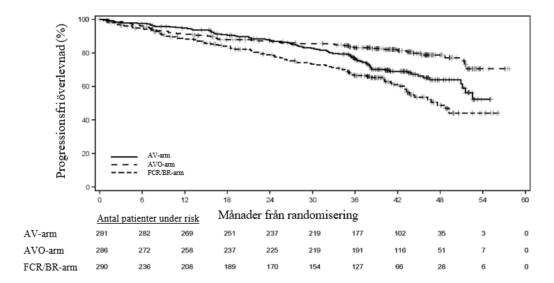 Vid slutlig analys, med en median uppföljningstid på 46,5 månader för Calquence och 45,3 månader för IR/BR, observerades en minskning med 72 % i risk för prövarutvärderad sjukdomsprogression eller död hos patienter i Calquence-armen. Den prövarutvärderade PFS medianen uppnåddes inte för Calquence och var 16,8 månader för IR/BR. Effektresultat enligt INV (Investigator assessments) presenteras i tabell 15. Kaplan-Meier-kurvan för INV-utvärderad PFS visas i figur 4.