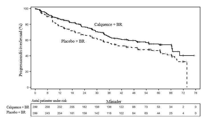 Med ytterligare 6 månaders uppföljning från den primära PFS-analysen och en medianuppföljning på 63,0 månader uppnåddes inte median total överlevnad i någon arm. Det totala antalet dödsfall var 218: 105 (35,1 %) i Calquence + BR-armen och 113 (37,8 %) i placebo + BR-armen. Effektresultaten presenteras i tabell 16. Kaplan-Meier-kurvorna över PFS visas i figur 5.