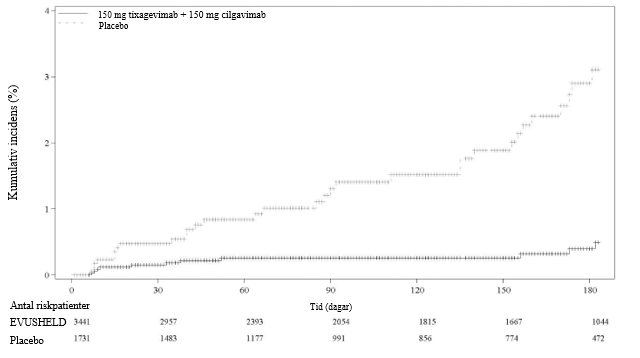 Primäranalysen inkluderade 5 172 deltagare som var RT‑PCR‑negativa för SARS‑CoV‑2 vid baslinjen, av vilka 3 441 fick EVUSHELD och 1 731 fick placebo. EVUSHELD minskade signifikant (p‑värde < 0,001) risken för RT‑PCR‑positiv symtomatisk SARS‑CoV‑2-sjukdom (covid‑19) jämfört med placebo (tabell 4). Medianuppföljningstiden efter dosering var 83 dagar.