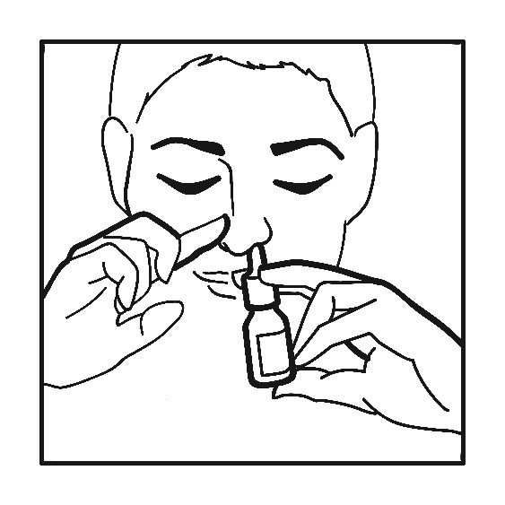 Snyt näsan och spraya en gång i vardera näsborre samtidigt som huvudet hålls lätt nedåtböjt (se figur). Torka av sprayspetsen efter användning och sätt tillbaka skyddslocket.