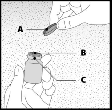 Injektionsflaskan är endast avsedd för engångsbruk. Innehållet i en injektionsflaska ska injiceras intramuskulärt omedelbart efter upptag i sprutan. Ta först bort plastlocket (A) men låt metallringen (B) och membranet (C) sitta kvar.