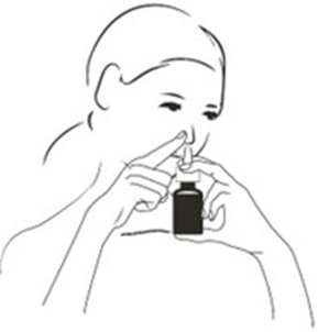 Skaka flaskan försiktigt i cirka fem sekunder före användning genom att vända den upp och ned några gånger. Ta därefter bort skyddslocket. Snyt näsan och spraya en gång i vardera näsborre samtidigt som huvudet hålls lätt nedåtböjt (se figur). Torka av sprayspetsen efter användning och sätt tillbaka skyddslocket.