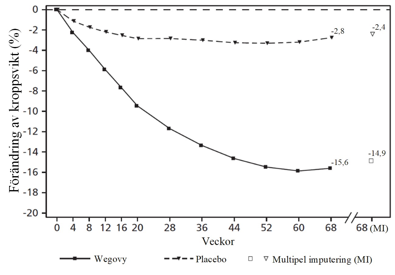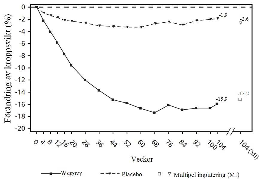 2 Under studien avbröts den randomiserade behandlingen permanent av 10,4 % och 10,4 % av patienterna som randomiserades till semaglutid 2,4 mg respektive placebo. Om man antar att alla randomiserade patienter stod kvar på behandling och inte fick ytterligare behandlingar mot obesitas, var de uppskattade förändringarna från randomisering till vecka 68 för BMI baserat på en blandad modell för upprepade mätningar, inklusive alla observationer fram till första avbrytandet, ‑17,9 % och 0,6 % för semaglutid 2,4 mg respektive placebo.