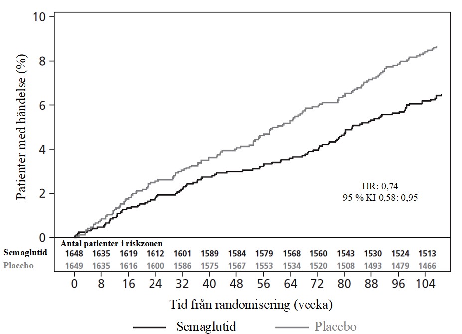 Bild 7: Kaplan-Meier-diagram över tid till första förekomst av de kombinerade händelserna: Kardiovaskulär död, icke-fatal hjärtinfarkt eller icke-fatal stroke (SUSTAIN 6)