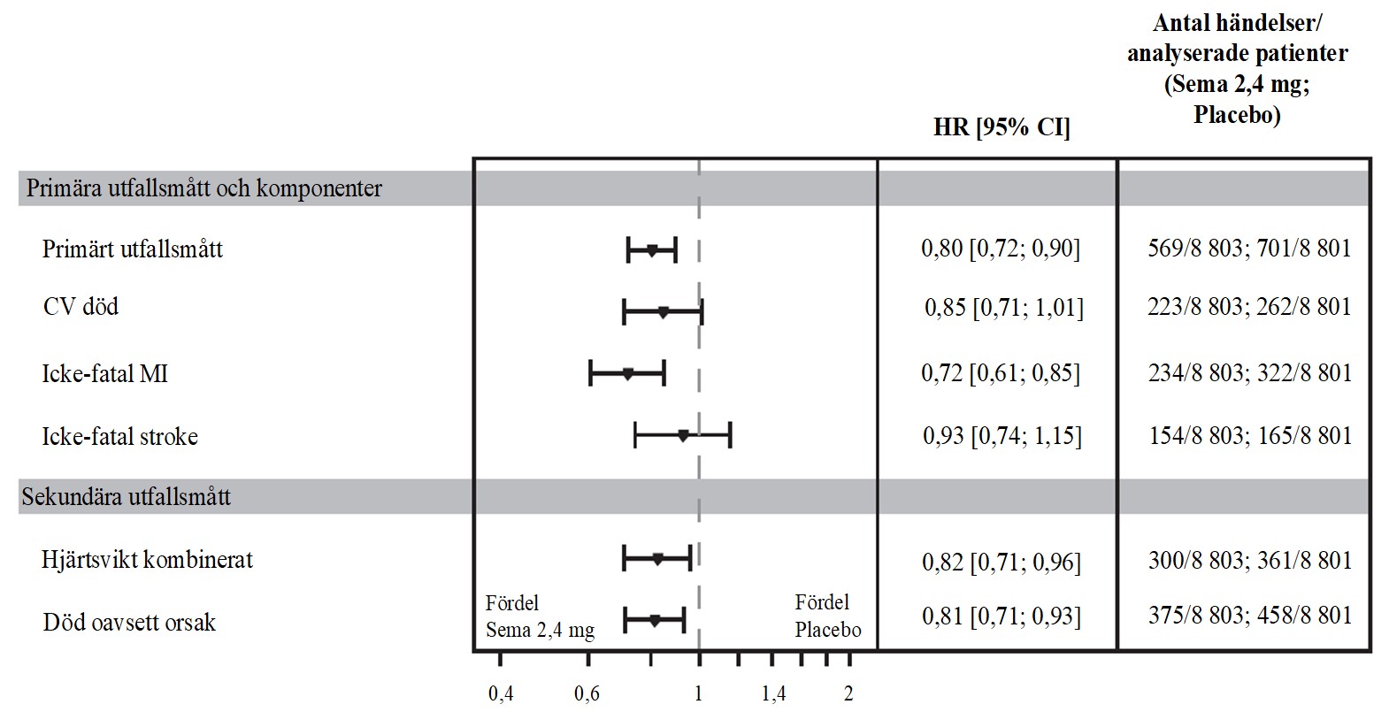 Behandlingsnyttan med semaglutid jämfört med placebo var densamma i alla subpopulationer definierade utifrån ålder, kön, BMI, ras, etnicitet, region, systoliskt blodtryck (SBP), LVEF och samtidig hjärtsviktsbehandling.