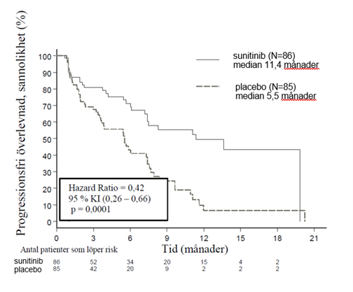 20,6 månader (95 % KI 20,6 - NR (ej uppmätt)) jämfört med placeboarmen ej uppmätt (95 % KI 15,5 NR) (hazard ratio: 0,409 (95 % KI: 0,187 - 0,894), p-värde = 0,0204]. Nio dödsfall inträffade i sunitinibarmen och 21 dödsfall i placeboarmen.