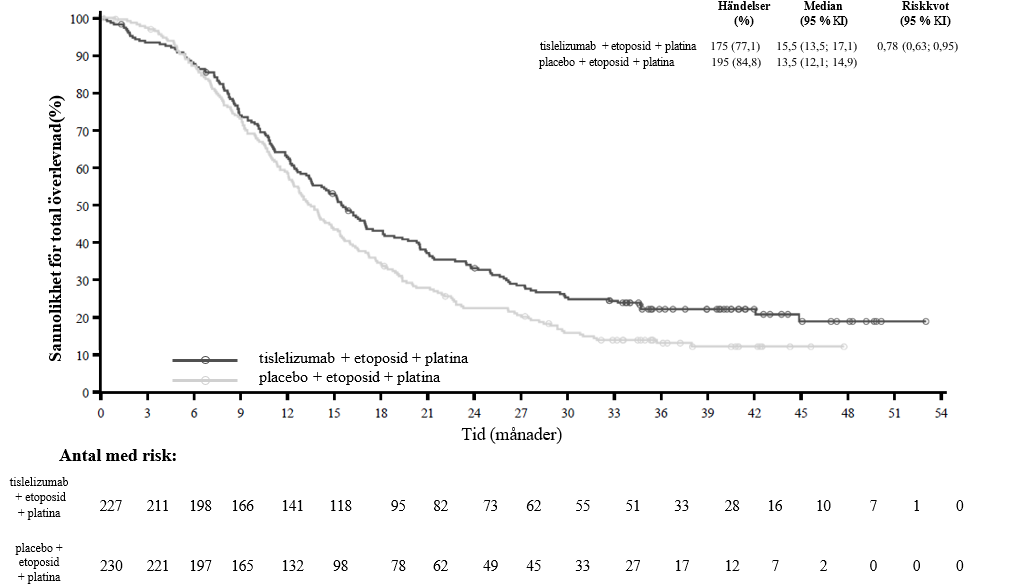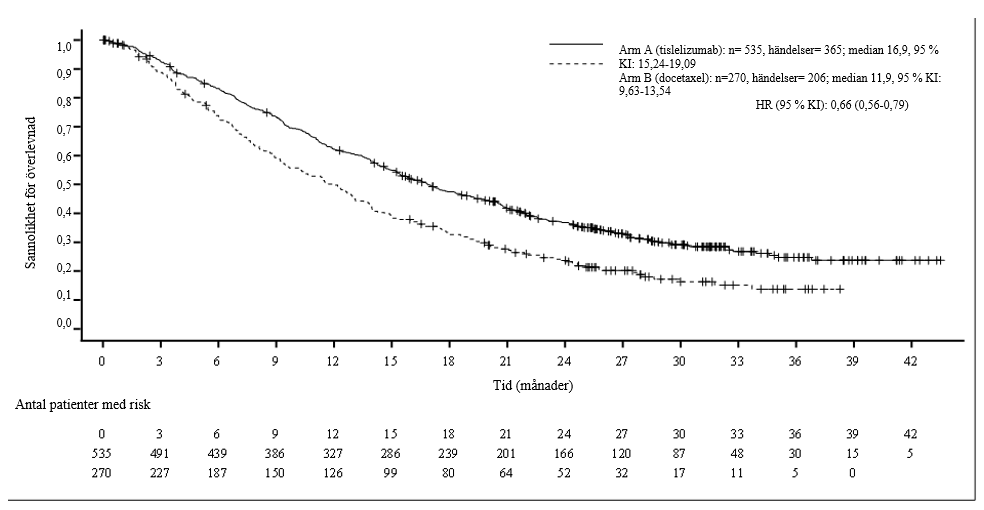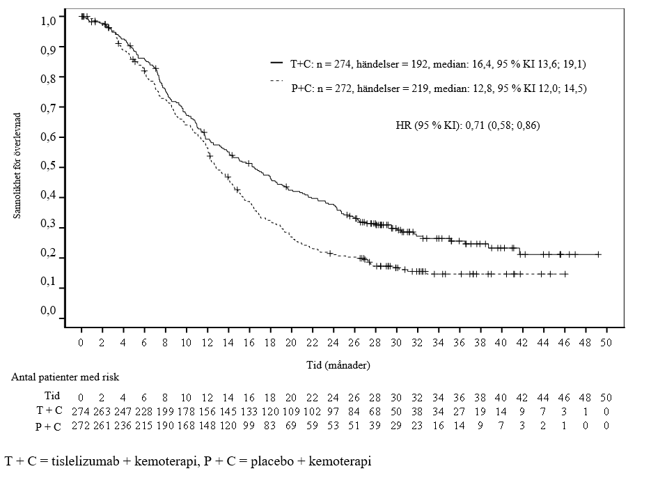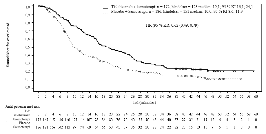 Vid den uppdaterade analysen av OS i PD-L1-positiva undergrupper (PD-L1-uttryck ≥ 10 %), var stratifierad HR för OS 0,54 (95 % KI: 0,36 till 0,79). Medianöverlevnaden var 10,2 månader (95 % KI: 8,5 till 14,5 månader) i tislelizumabgruppen och 5,1 månader (95 % KI: 3,8 till 8,2 månader) i ICC-gruppen.