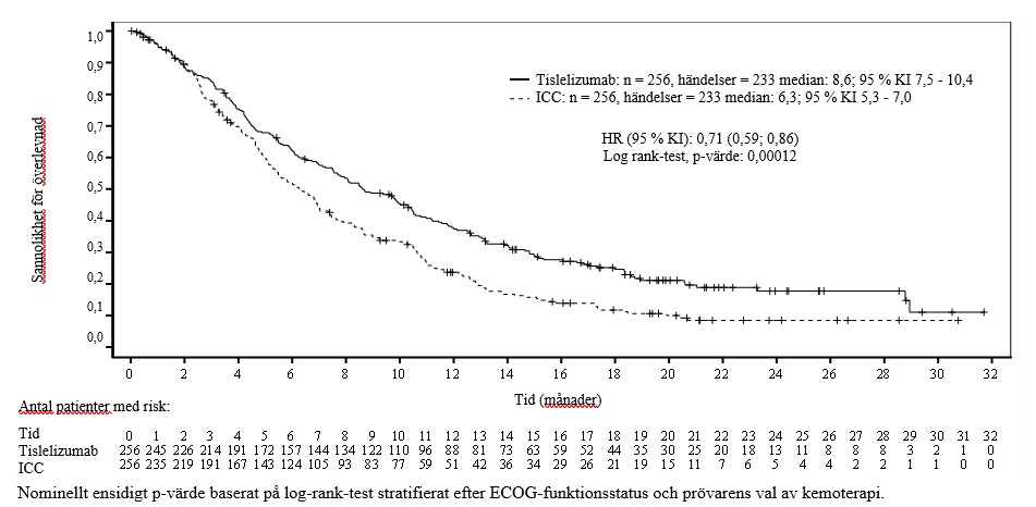 Vid tidpunkten för den förspecificerade slutliga analysen visade BGB A317 302 en statistiskt signifikant förbättring av OS hos patienterna som randomiserats till tislelizumab jämfört med hos patienterna i ICC-gruppen. Stratifierat HR var 0,70 (95 % KI: 0,57; 0,85; 1-sidigt p-värde på 0,0001) med en median-OS på 8,6 månader (95 % KI: 7,5; 10,4) i tislelizumab-armen jämfört med 6,3 månader (95 % KI: 5,3; 7,0) i ICC-armen. Mediantiden för uppföljning enligt omvänd Kaplan-Meier-metod var 20,8 månader i tislelizumabgruppen och 21,1 månader i ICC-gruppen.