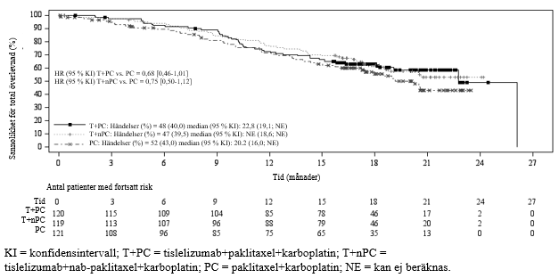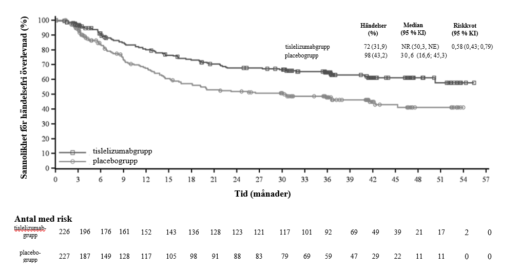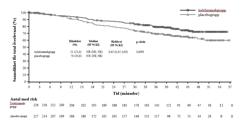 En uppdaterad analys med ytterligare 24 månaders uppföljning efter den förspecificerade slutliga analysen visade fortsatt samma effektresultat som vid den slutliga analysen. Mediantiden för uppföljning enligt omvänd Kaplan-Meier-metod var 44,7 månader i tislelizumab-armen och 44,0 månader i ICC-armen.