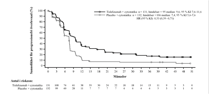Tislelizumab eller placebo administrerades fram till sjukdomsprogression eller oacceptabel toxicitet. Patienter i placebogruppen fick möjlighet att gå över till tislelizumab som monoterapi efter av IRC bekräftad sjukdomsprogression.