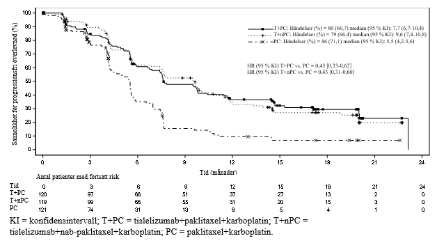 Vid tidpunkten för den förspecificerade interimsanalysen (brytdatum för data den 26 mars 2021) visade BGB‑A317‑309 en statistiskt signifikant förbättring av PFS för patienter randomiserade till gruppen som fick tislelizumab i kombination med gemcitabin och cisplatin jämfört med gruppen som fick placebo plus gemcitabin och cisplatin. Stratifierad HR var 0,52 (95 % KI: 0,38; 0,73; 1‑sidigt p‑värde < 0,0001), med en median‑PFS på 9,2 månader i gruppen som fick tislelizumab plus kemoterapi jämfört med 7,4 månader i gruppen som fick placebo plus kemoterapi.