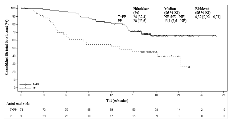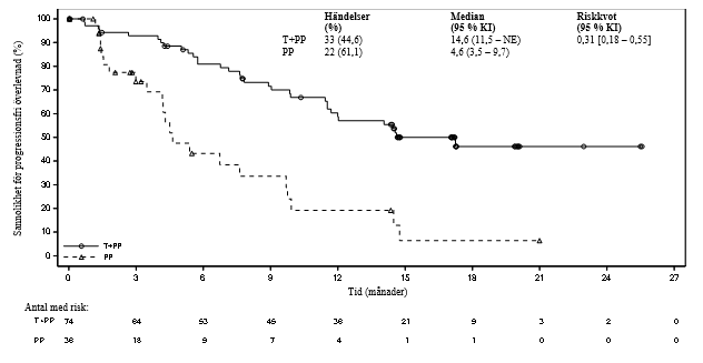 Primärt effektmått var progressionsfri överlevnad (PFS) bedömt av IRC enligt RECIST v1.1 i intent‑to‑treat-analysgruppen (ITT). De sekundära effektmåtten var total överlevnad (OS), PFS enligt prövarens bedömning, objektiv svarsfrekvens (ORR) och svarsduration (DoR) bedömt av IRC.
