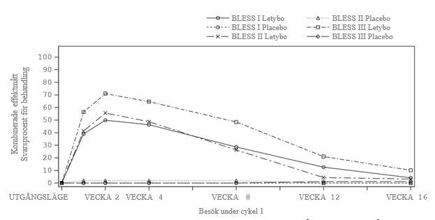 Figur 1 Tidslinje för svarsprocent (förbättring med ≥ 2 poäng på FWS krävs i både patientens och prövarens bedömning) under cykel 1 för aktiv behandling jämfört med placebobehandling i pivotala BLESS-studier