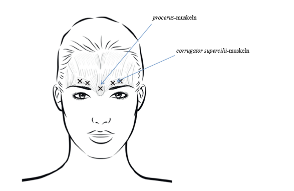 För att minska risken för komplikationen blefaroptos måste injektioner nära levator palpebrae superioris-muskeln undvikas, särskilt hos patienter med större depressorkomplex vid ögonbrynet. Vid injektion på två ställen i varje corrugator supercilii-muskel bör den första injektionen göras precis ovanför ögonbrynens mediala marginal. Den andra injektionen görs ungefär 1 cm ovanför ögonbrynsbenet (den stela, beniga gränsen som man kan känna ovanför den övre delen av det övre ögonlocket) där ögonbrynens mittlinjer möts. Injektionsstället i procerus-muskeln är precis ovanför mittlinjen på näsbryggan, där horisontella rynkor bildas mellan ögonbrynens mediala ändar. Vid injektion i de mediala ändarna av corrugator supercilii-musklerna och på ögonbrynens mittlinjer bör injektionsstället vara minst 1 cm från ögonbrynsbenet (den stela, beniga gränsen som man kan känna ovanför den övre delen av det övre ögonlocket).
