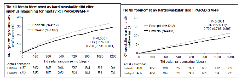 Sakubitril/valsartan var överlägset enalapril genom att minska risken för kardiovaskulär död eller sjukhusinläggning till 21,8 % jämfört med 26,5 % för patienterna som fick enalapril. Absolut riskreduktion var 4,7 % för kardiovaskulär död och sjukhusläggning på grund av hjärtsvikt sammantaget, 3,1 % för enbart kardiovaskulär död och 2,8 % för enbart den första sjukhusinläggningen. Relativ riskreduktion var 20 % jämfört med enalapril (se tabell 3). Denna effekt observerades tidigt och kvarstod under hela studien (se figur 1). Båda komponenterna bidrog till riskreduktionen. Plötslig död stod för 45 % av de kardiovaskulära dödsfallen och minskade med 20 % hos de sakubitril/valsartan-behandlade patienterna jämfört med hos dem som fick enalapril (hazard ratio [HR] 0,80, p=0,0082). Sviktande pumpförmåga stod för 26 % av de kardiovaskulära dödsfallen och minskade med 21 % hos de sakubitril/valsartan-behandlade patienterna jämfört med hos dem som fick enalapril (HR 0,79; p=0,0338).