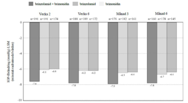 Alla behandlingsdifferenser (brinzolamid + brimonidin mot enskilda komponenter) var statistiskt signifikanta med p=0,0001 eller lägre.