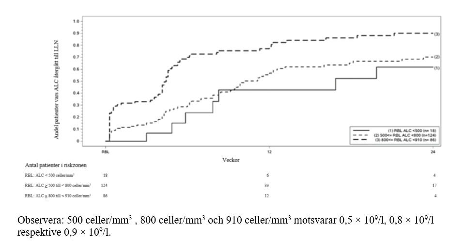 behandlingen ska sättas ut hos patienter med långvarig svår lymfopeni (lymfocyttal < 0,5 × 109/l) som pågår i mer än sex månader.