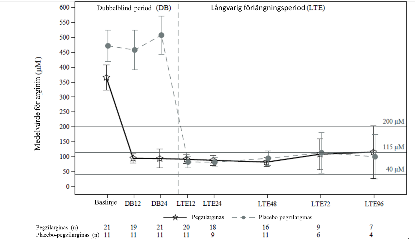 Under den öppna förlängningen uppvisade studiedeltagare som tidigare fått pegzilarginas kvarstående förbättringar av argininnivåerna i plasma, GMFM-E- och GMFM-D-värden och 2MWT. De studiedeltagare som initialt randomiserades till placebo och behandlades med pegzilarginas under den öppna förlängningsperioden uppvisade också liknande minskningar av de genomsnittliga plasmanivåerna av arginin från baslinjen (figur 2).