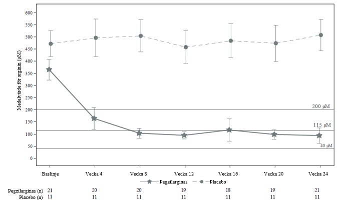 Behandling med pegzilarginas resulterade i en statistiskt signifikant minskning av plasmaarginin jämfört med placebo (p< 0,0001) efter 24 veckors behandling (tabell 2 och figur 1). Plasmaargininnivåer under det rekommenderade målet och inom normalt intervall uppnåddes hos 90,5 procent av de patienter som behandlades med pegzilarginas jämfört med 0 procent av studiedeltagarna i placeboarmen (tabell 2 och figur 1).