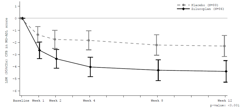 Vid vecka 12 observerades en kliniskt betydelsefull och i hög grad statistiskt signifikant förbättring av MG-ADL-totalpoäng (figur 1) och QMG-totalpoäng för zilukoplan jämfört med placebo.