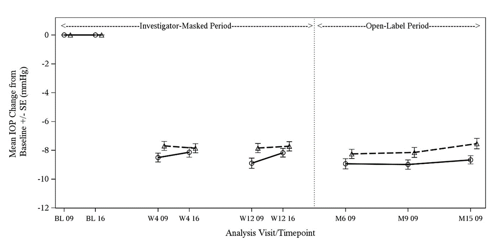 Effekten på intraokulärt tryck sågs efter den första behandlingsveckan (se tabell 2) och bibehölls under hela 12-veckorsperioden, precis som hos vuxna.