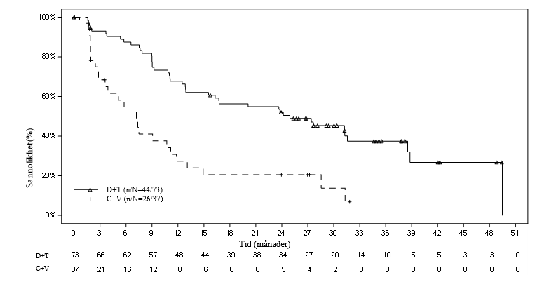 Vid tidpunkten för den primära analysen, visade ORR i dabrafenib plus trametinib-armen en statistiskt signifikant förbättring som översteg karboplatin plus vinkristin. Efterföljande hierarkisk testning visade också på en statistiskt signifikant förbättring vad gällde progressionsfri överlevnad (PFS) jämfört med kemoterapi (tabell 6).