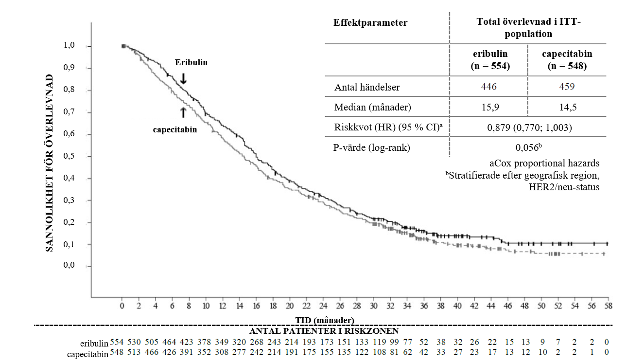 Den positiva effekten på total överlevnad sågs både i capecitabinnaiva patientgrupper och i patientgrupper som tidigare behandlats med capecitabin. Den uppdaterade analysen av total överlevnad visade en överlevnadsfördel för eribulingruppen jämfört med TPC-gruppen både hos patienter som tidigare behandlats med capecitabin, med en riskkvot på 0,787 (95 % CI: 0,645; 0,961), och för de capecitabinnaiva patienterna med en motsvarande riskkvot på 0,865 (95 % CI: 0,606; 1,233).