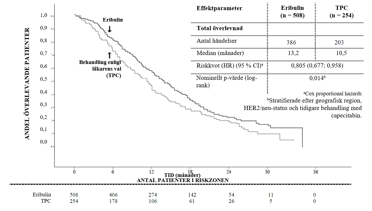 Det primära resultatmåttet i studien uppnåddes med ett resultat för total överlevnad (overall survival, OS) som var statistiskt signifikant bättre i eribulingruppen jämfört med TPC-gruppen i 55 % av händelserna.