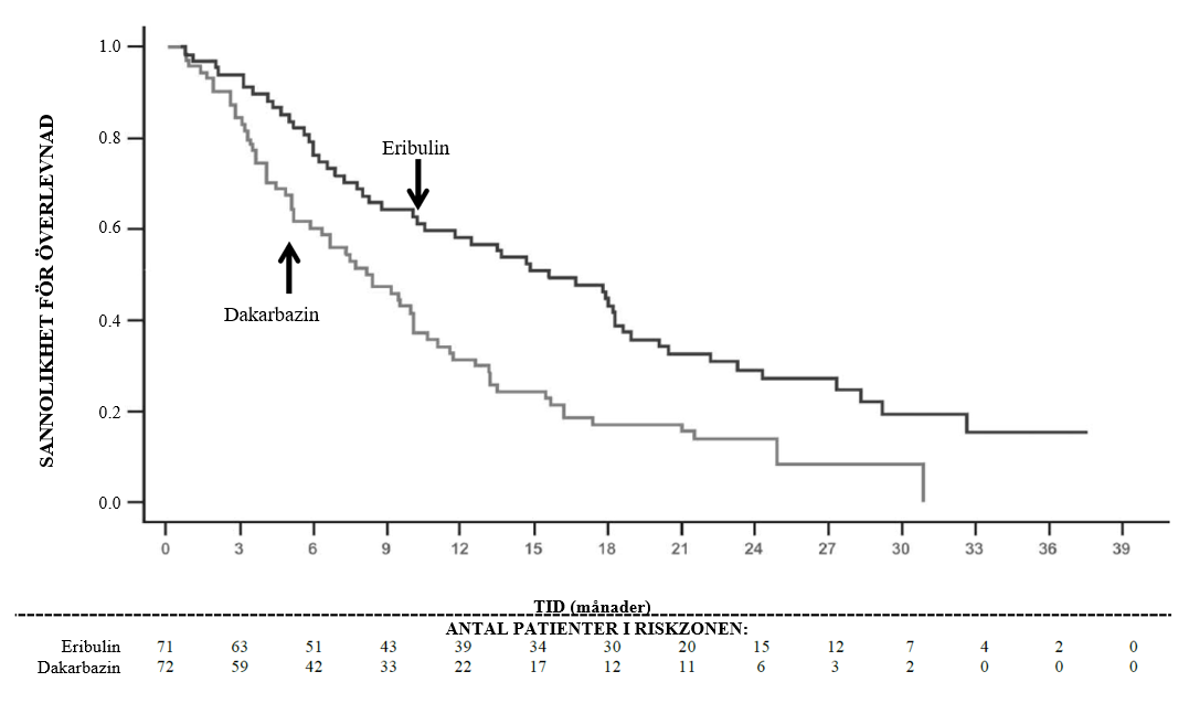 I studie 309 sågs en statistiskt signifikant förbättring av total överlevnad (OS) hos patienter som randomiserats till eribulinarmen jämfört med kontrollarmen. Detta översattes till en förbättring på 2 månader av median-OS (13,5 månader för eribulinbehandlade patienter mot 11,5 månader för dakarbazinbehandlade patienter). Det fanns ingen signifikant skillnad i progressionsfri överlevnad eller total svarsfrekvens mellan behandlingsarmarna i den totala populationen.