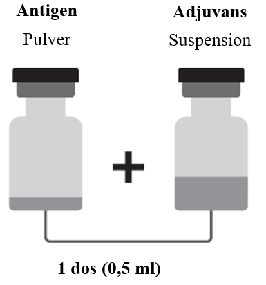 Suspension till 1 dos i en injektionsflaska (typ I-glas) med propp (butylgummi) och ett brunt snäpplock (adjuvans).