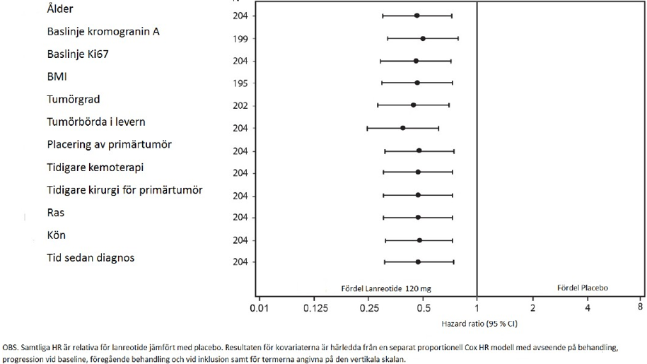 Den gynnsamma effekten av lanreotid i minskning av risken för progression eller död var konsekvent oberoende av placeringen av primärtumör, tumörbörda i levern, tidigare kemoterapi, baslinjen för Ki67, tumörgrad eller andra redan specificerade egenskaper som visas i Figur 2.